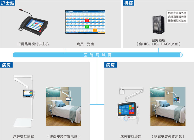 支持護(hù)士站主機(jī)、醫(yī)生主機(jī)、床旁交互終端間的視頻會(huì)診。