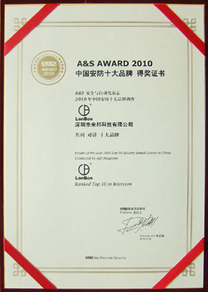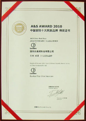 新聞中心 2010年11月1日,由A&S舉辦的2010年度的“中國安防十大品牌暨中國安防十大民族品牌”頒獎活動在北京皇家大飯店隆重舉行,來邦憑借品牌的實力、影響力及技術的創新力,連續七年榮獲 “2010中國安防十大品牌”和“2010中國安防十大民族品牌”兩大獎項。