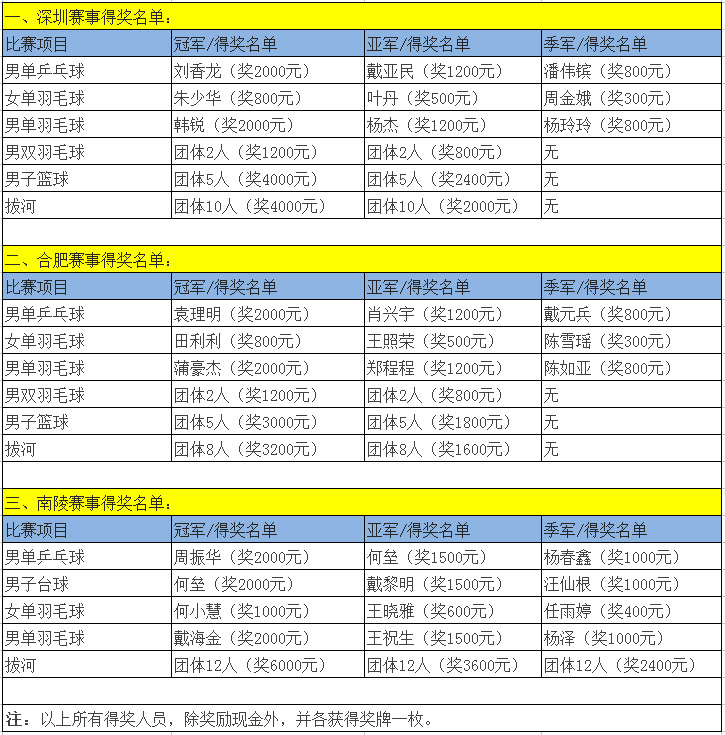 賽場上,運動健兒們激情飛揚、奮力拼搏,最終評出羽毛球、乒乓球、籃球、臺球、拔河競賽的前三名。公司對勝出者頒發了獎金和獎牌(附表)。