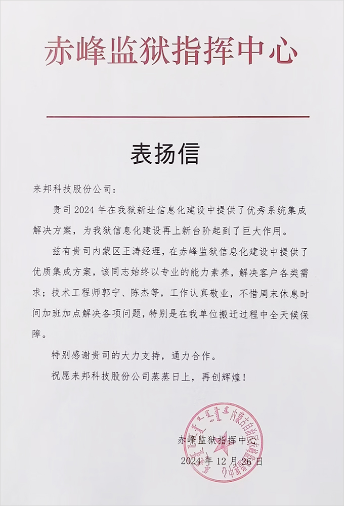 2024年12月26日,公司收到內蒙古赤峰監獄發來的表揚信,提到公司在該監獄新址信息化建設提供的優秀系統集成解決方案為監獄信息化建設再上新臺階起到了巨大作用,并對公司王濤經理專業的能力素養解決各類需求,以及技術工程師郭寧、陳杰等人的認真敬業、辛勤付出,予以表揚和感謝。