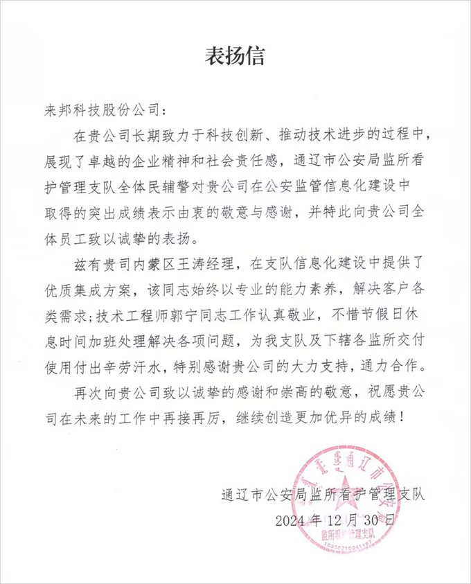 優質履約、積極作為、勇于擔當。歲末年初,公司接連獲得內蒙古赤峰監獄、通遼市公安局監所看護管理支隊發來的表揚信,這些表揚信不僅是對來邦既往辛勤努力的肯定,更是對公司未來發展的鼓勵及期待。