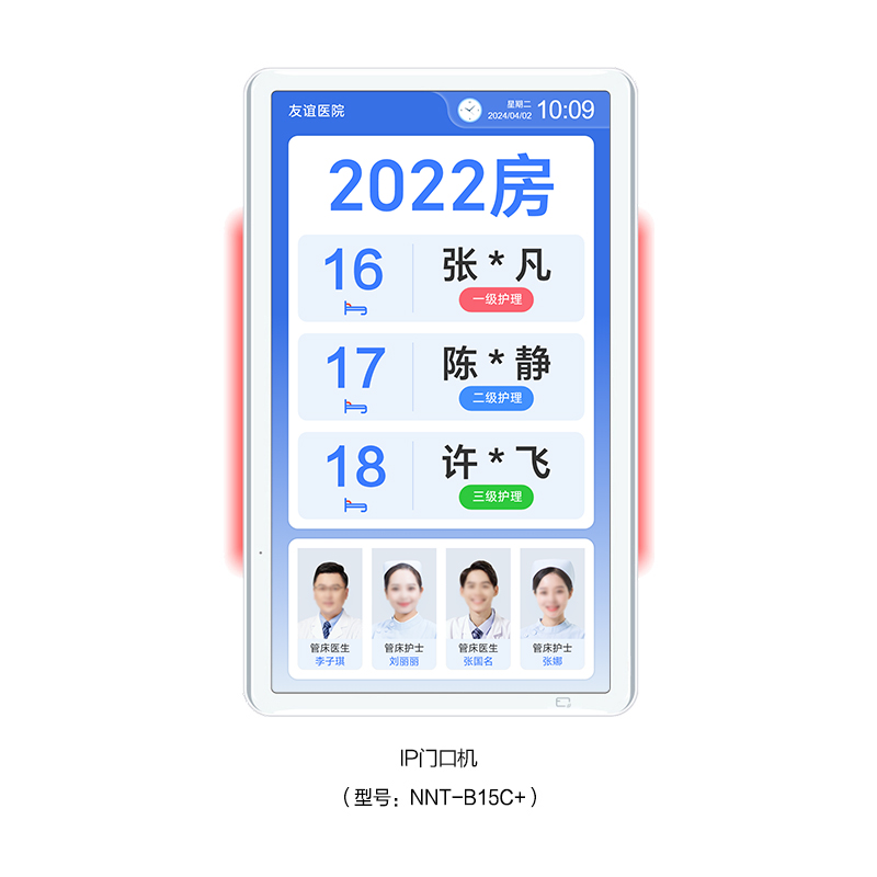 ? 采用15.6英寸觸摸顯示屏,內(nèi)置燈帶雙側(cè)發(fā)光設(shè)計,壁掛式安裝在病房門口。