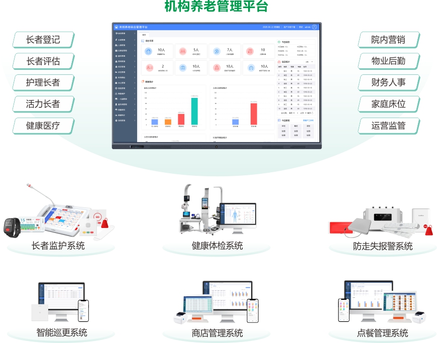 是機構運營管理的核心。滿足接待、醫護、人事、后勤、財務、領導等不同崗位的日常工作需求,同時將各職能部門和服務單元連成一個有機整體,并可通過各項業務數據的統計報告,輔助決策者不斷優化調整運營策略。