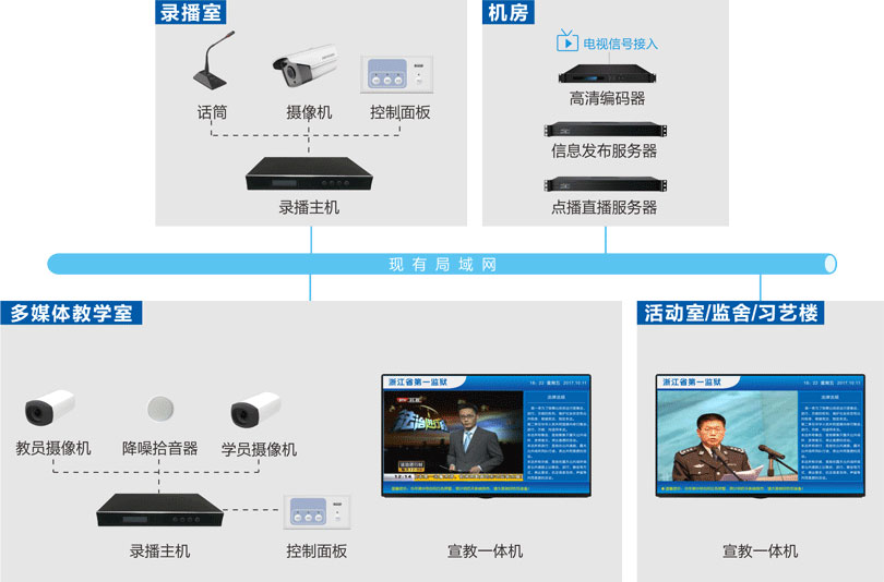 來邦電化教育系統  集成了教學資源錄入和管理、課程表播放計劃管理、現場教學的直播與錄播、監室的音頻播放與視頻點播、宣教發布、自主學習考試、資源共享等功能模塊,滿足對監獄對服刑人員日常教育的需要。