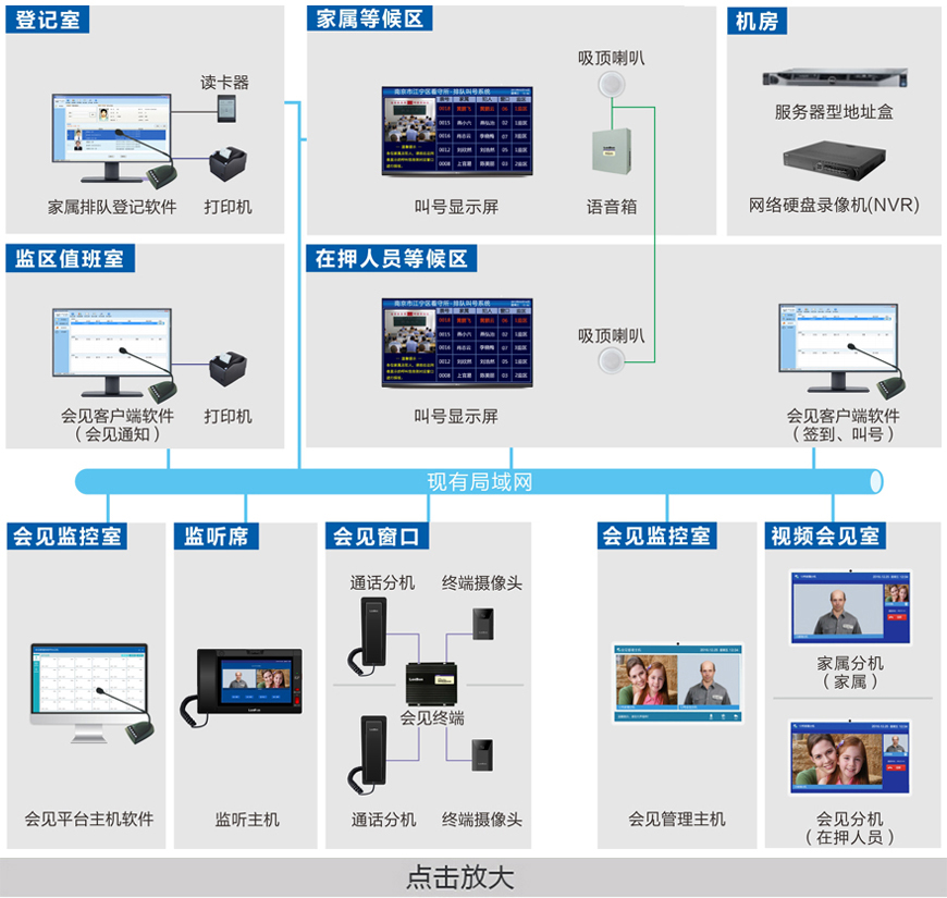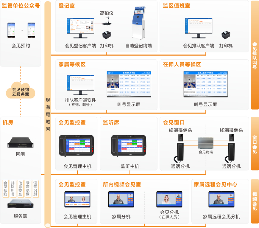 家屬會見管理系統 采用IP網絡架構,系統包括取號排隊、會見登記、會見通知、排隊叫號、會見監管、錄音錄像、復聽審查、獄務公開查詢等管理模塊,采用IP網絡音視頻通訊、雙攝像機監控、雙畫面合成、人臉識別等技術,設計出一套更符合看守所家屬會見監管業務需求的智能化系統。