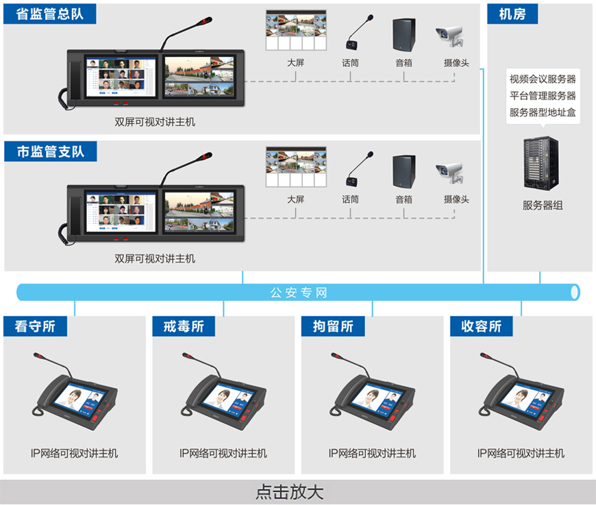 公安監管視頻會議指揮系統 基于IP網絡架構(可跨網段跨路由),以高清音視頻編解碼技術為核心,構建了一套功能完善、擴展性強、實時性高的聯網式音視頻實時交互平臺。實現省監管總隊、市監管支隊、所指揮中心之間的實時溝通、視頻會議、遠程督察等用途。