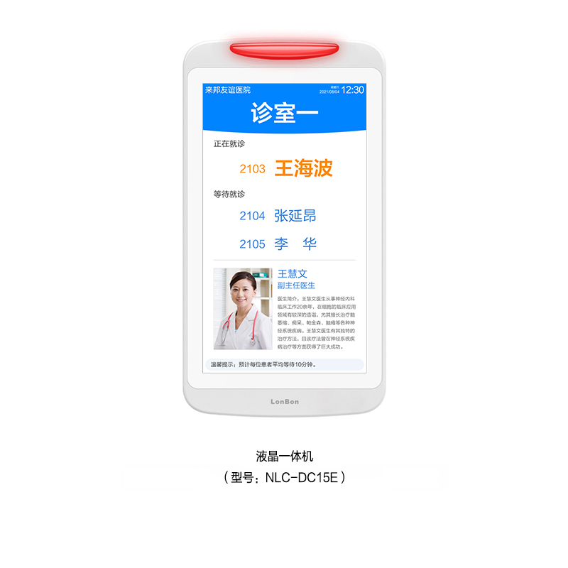 ? 采用15.6英寸液晶顯示屏,內置燈帶雙側發光設計,壁掛式安裝在診室門口。