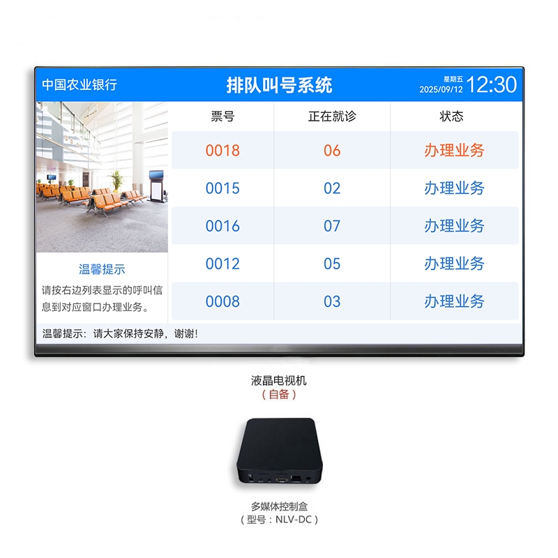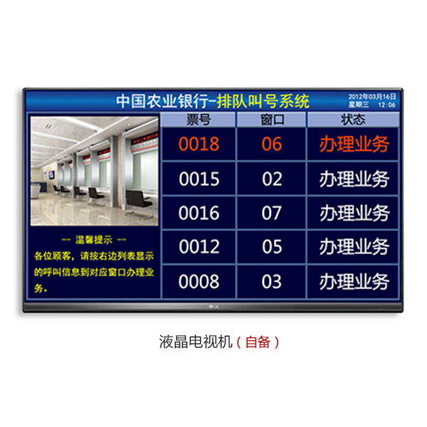 ? 具有顯示票號信息、窗口信息、業務狀態、播放視頻、顯示文字通知、接收信息發布、HDMI輸出等功能。