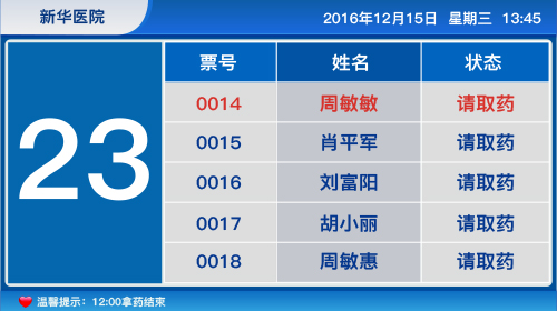 語(yǔ)音報(bào)號(hào):可語(yǔ)音播報(bào)取藥患者的姓名、相應(yīng)的取藥窗口號(hào)。