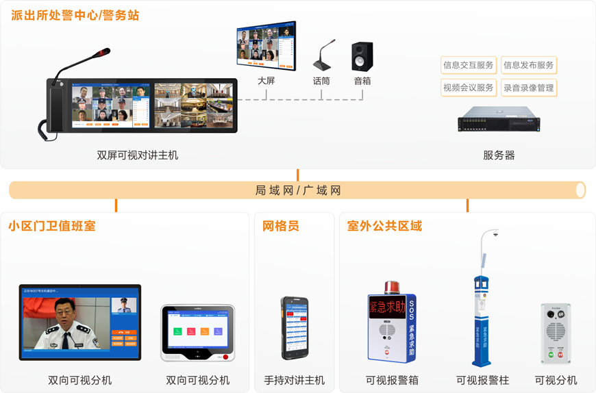 派出所要能快速便捷的與上級部門或其他職能部門可視對講、視頻會商等,達(dá)到協(xié)同處警的目的。