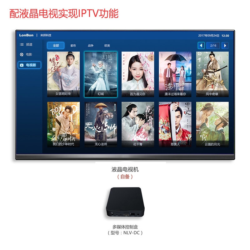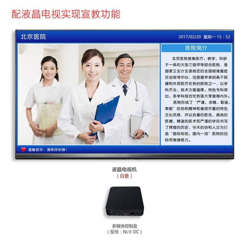 局域網傳輸,多媒體控制盒(型號:NLV-DC)可通過HDMI線外接液晶顯示屏 、電視機、全彩拼接屏(矩陣)等顯示設備(顯示設備需自備)。